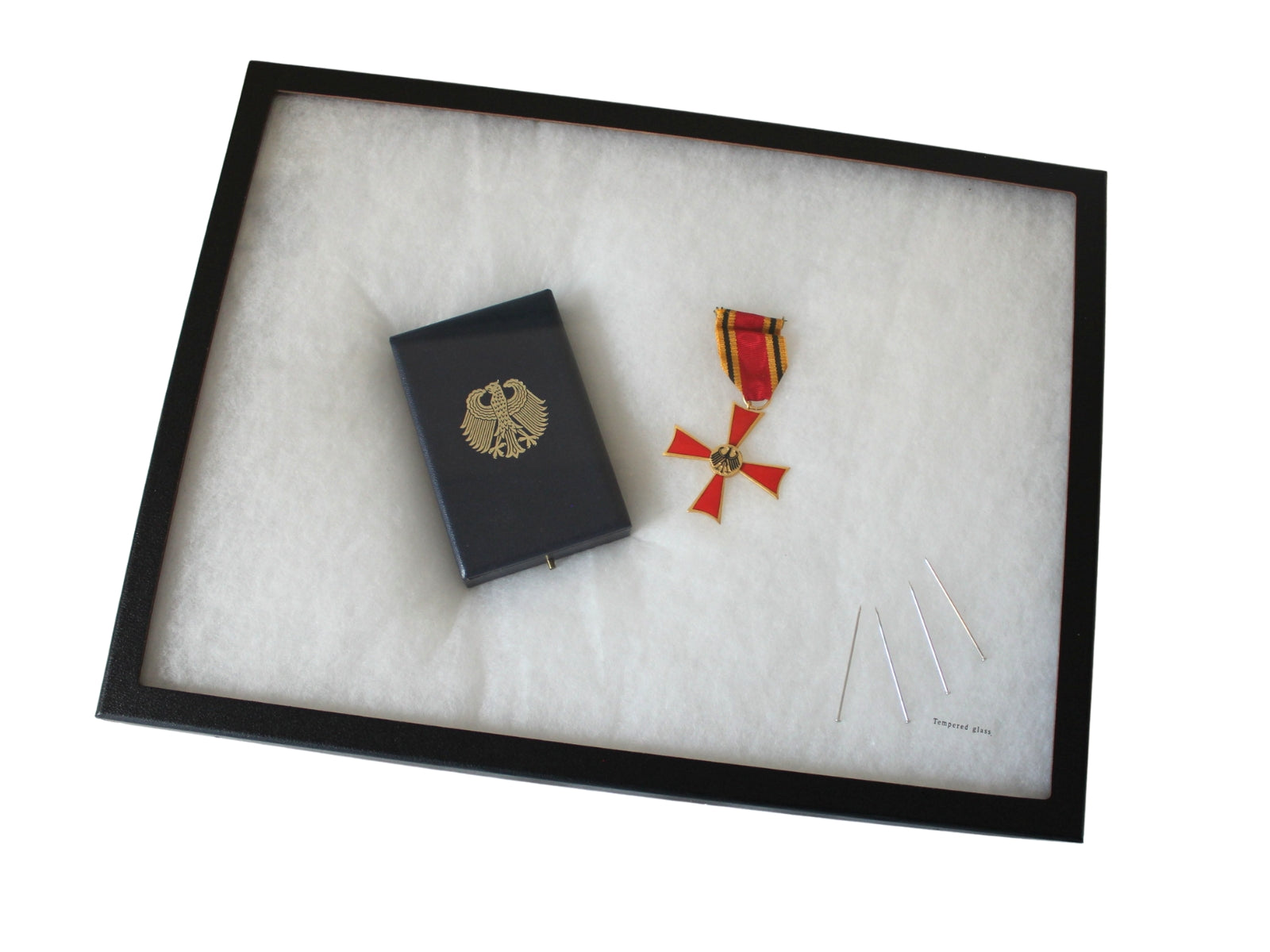 Sammelvitrine, Sammlervitrine, Ordenvitrine, Schaukasten mit Echtglasscheibe, ca. 41 x 31 x 2,5cm, weißes Füllmaterial, Stifte liegen lose bei